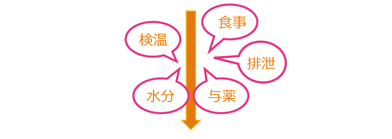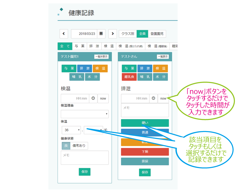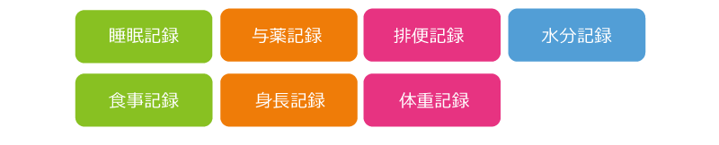 検温、排泄、食事、水分、与薬など様々な健康記録をワンタッチで記録、入力します。