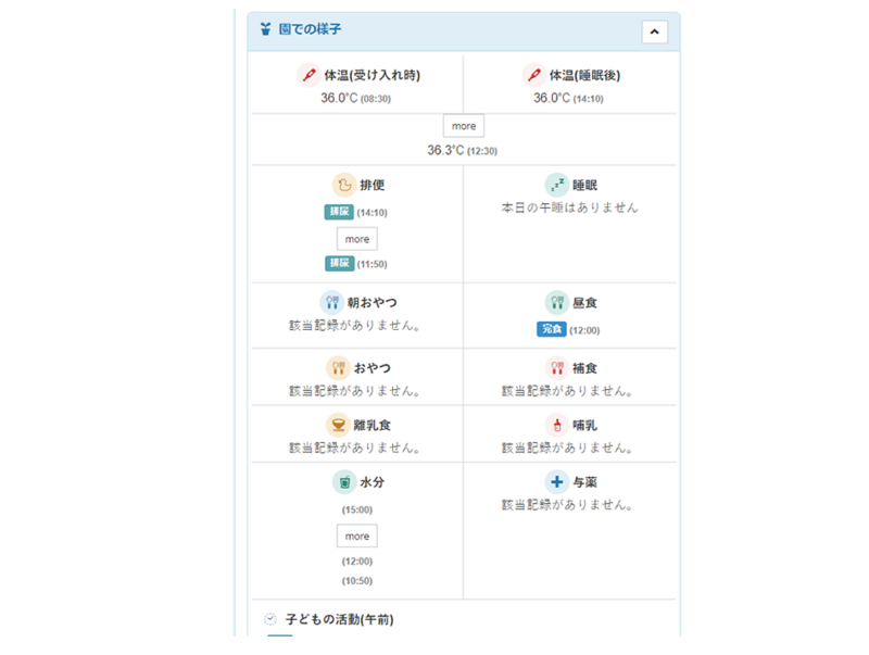 園児の活動記録、健康情報・食事などの情報は連絡帳や保育日誌と連動します。同じ情報を各書類に移す手間が省けます。