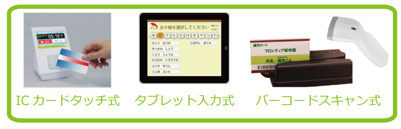 本システムは標準ではPCタッチパネルorバーコード打刻を採用していますが、どの打刻ツールにも対応することが可能です。貴園の運営形態や設置場所などご相談ください。